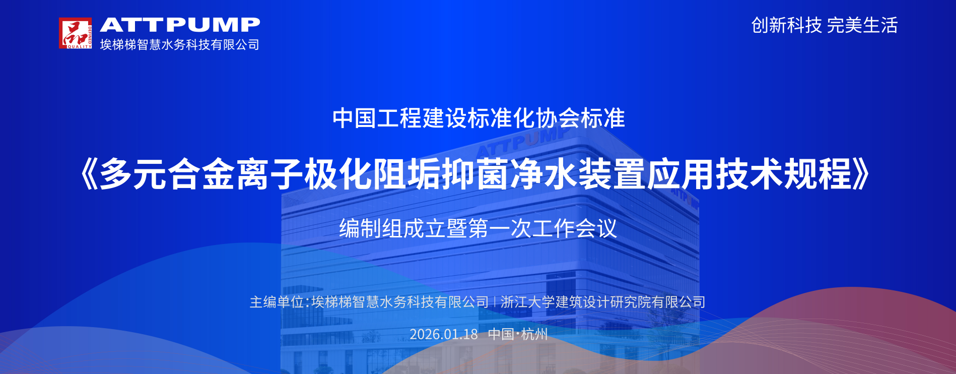 2026年1月18日,由埃梯梯智慧水务科技有限公司和浙江大学建筑设计研究院有限公司主编,中国电建集团华东勘测设计研究院有限公司、中元国际(上海)工程设计研究院有限公司、中国建筑西北设计研究院有限公司、中南建筑设计研究院有限公司、中国航空规划设计研究总院有限公司等16家单位参编的中国工程建设标准化协会标准《多元合金离子极化阻垢抑菌净水装置应用技术规程》编制组成立暨第一次工作会议在浙江杭州顺利召开。中国工程建设标准化协会建筑与市政工程产品应用分会顾泰昌秘书长、杨进春副秘书长、相关专家及编制组全体成员参加了本次会议。